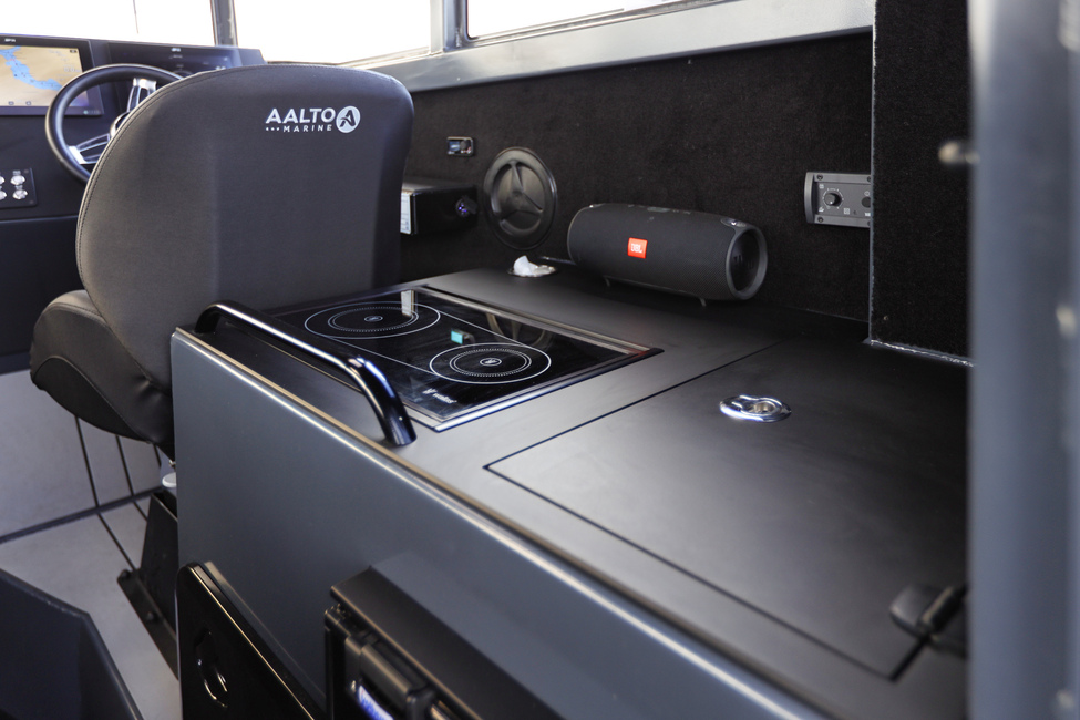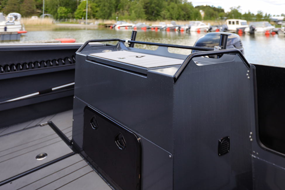 Veneen olemus on vankka ja moderni. Kokonaan tummanharmaalla maalattu alumiinirakenne viestii ominaisuuksista, joilla pärjää kovassa merikelissä.