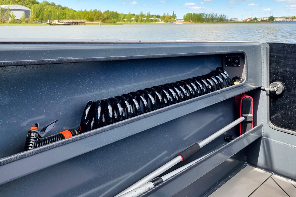 Fiksu varuste on myös merivedellä toimiva vesiletku taka-avotilan nopeaan puhdistukseen.