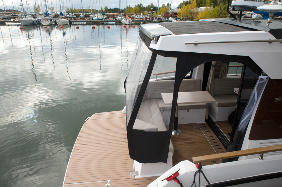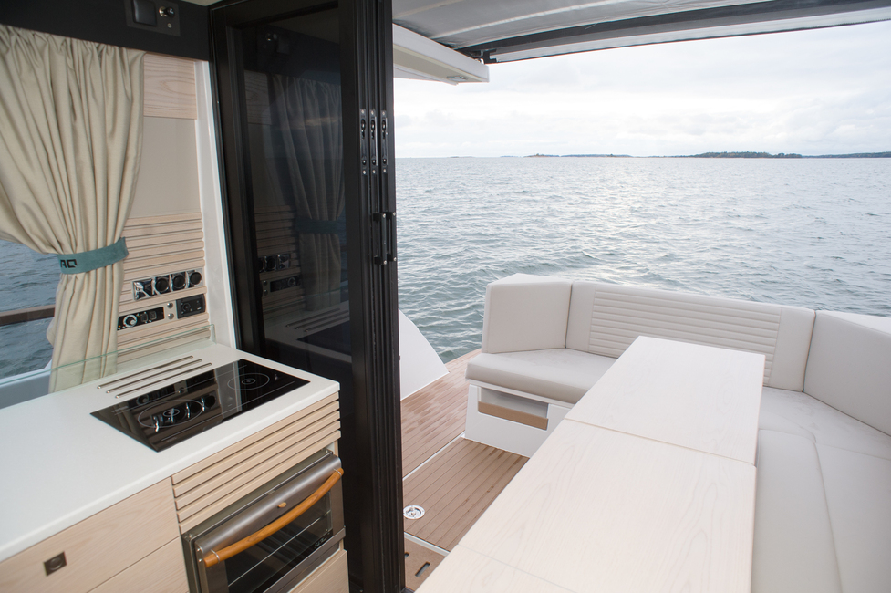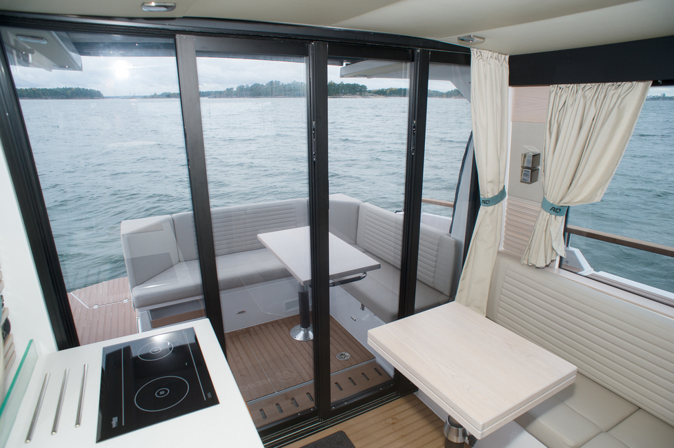 Matkustajia ja satamavieraita ajatellen 35 AQ:n hienoin osa on ulos aukeava salonki. Perän sohvaryhmä ja pöytä ovat ulkona, mutta liukuovet avaamalla ne saa osaksi sisustan pöytäryhmää. Tuloksena on pitkä pöytä vähintään kuudelle ruokailijalle. Irtotuoleja lisäämällä voi saada kattauksen jopa kymmenelle. Istuma-asento on myös sopivan ryhdikäs ruokailua ajatellen, eli mikään röhnötyssohva tämä ei ole.