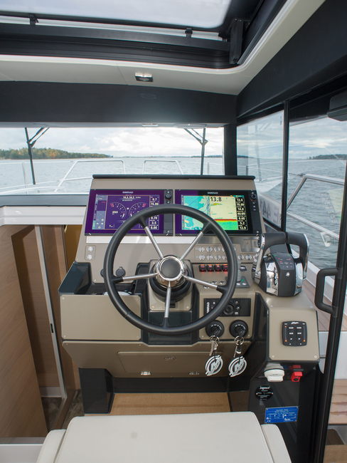 Kuskin paikalla huomaa heti monta hyvää asiaa ja muutaman huonon. Hyvinä puolina jo kehutut käynti liukuovesta sivukannelle ja joystick sekä yleisesti runsas ja hyvin käsillä oleva varustelu. Monitoiminäyttö – tai koeajoveneen lisävarusteiset kaksi näyttöä – on hyvin näkyvällä paraatipaikalla. Tilttiratti kääntyy haluttuun asentoon ja kaukohallintalaitteet ovat sopivassa paikassa niin seisten kuin istuen ajamiseen. Puhelimelle tai pikkutavaroille on hyvä lokero. Toisaalta mukiteline puuttuu.