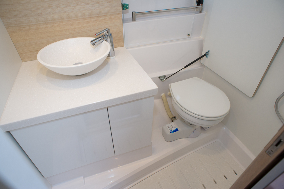 Sekä vessan että makuuhyttien ovet nimittäin ovat suurpiirteisesti mitoitettuja liukuovia. Ne toivottavasti paranevat tuotannon edetessä – koeajoyksilö oli ensimmäinen valmistunut 35 AQ. Raosta kurkittavat ovet nimittäin voivat olla monella tapaa kiusallisia.