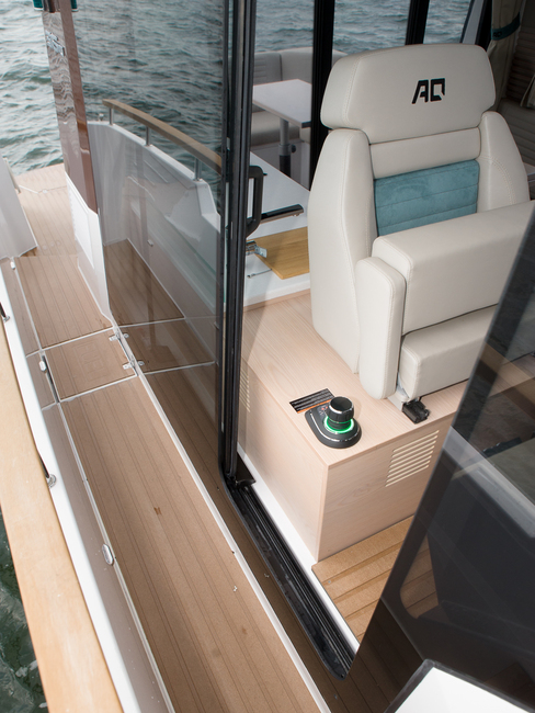 Paras käytännöllisyysplussa moniin muihin – kuten kotimaiseen pääkilpailijaan Grandezza 34 OC:hen – verrattuna on kuskin liukuovi sivukannelle. Se auttaa tekemään AQ 35:stä melko helposti myös yksin käsiteltävän veneen. Styyrpuurin puolelle laituriin kylkikiinnittyessä voi nopsasti käydä laittamassa lepuuttajat ja laituriin tultaessa köydet, vaikkapa ensin vain keskiköyden.