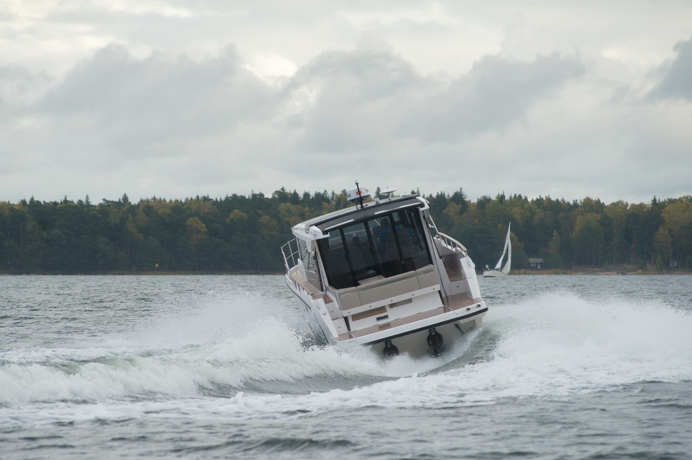 Tätä manööveria helpottaa erityisesti vakiona Mercury TDi 260-heppaisten tuplamoottorien yhteydessä oleva joystick-ohjaus. Sillä venettä voi liikuttaa helposti vaikka suoraan sivuttain. Skyhook-toiminto taas auttaa pitämään veneen paikallaan tuulista ja virtauksista huolimatta. Tuplamoottorit kaasuttelevat ja vetolaitteet kääntelevät vinhasti niin että tämä toteutuisi.