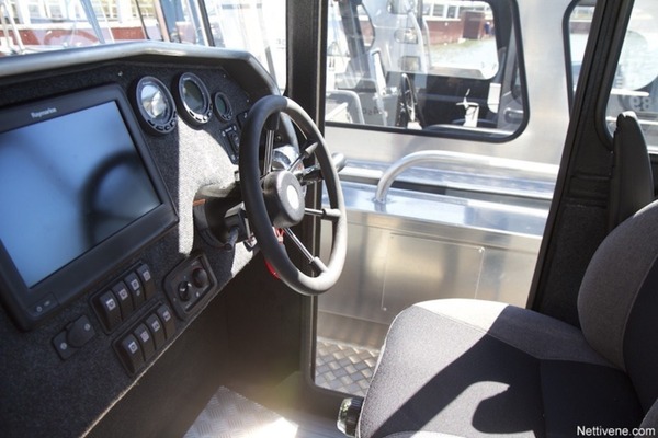 Sisätiloissa jatkuu ulkoa tuttu toimiva, mutta karu ilme. Kipparilla on hyvä pääsy kaikkiin veneen hallintalaitteisiin, tosin ajoasennossa kaasukädelle ei ole hyvää lepopaikkaa. Keskimittainen saa kuitenkin itselleen hyvän ajoasennon, ja painon mukaan säädettävät joustinpenkit ovat erittäin mukavat. Ratissa ei ole erillisiä etäisyys- tai kulmasäätöjä, vaan koko etukonsolia voi kallistaa. Etukonsolin ylälaidassa on pyöreä metallisuojus, mutta jostain käsittämättömästä syystä Arrnoet ei ole tehnyt siihen käsiaukkoja. Nyt pelkääjän puolella ei ole lainkaan tartuntakahvaa. Myös molemmin puolin olevien kulkuaukkojen reuna kaipaa kahvaa. Hytissä on tilaa neljälle, mutta takana olevalla ei ole paljoa jalkatilaa.