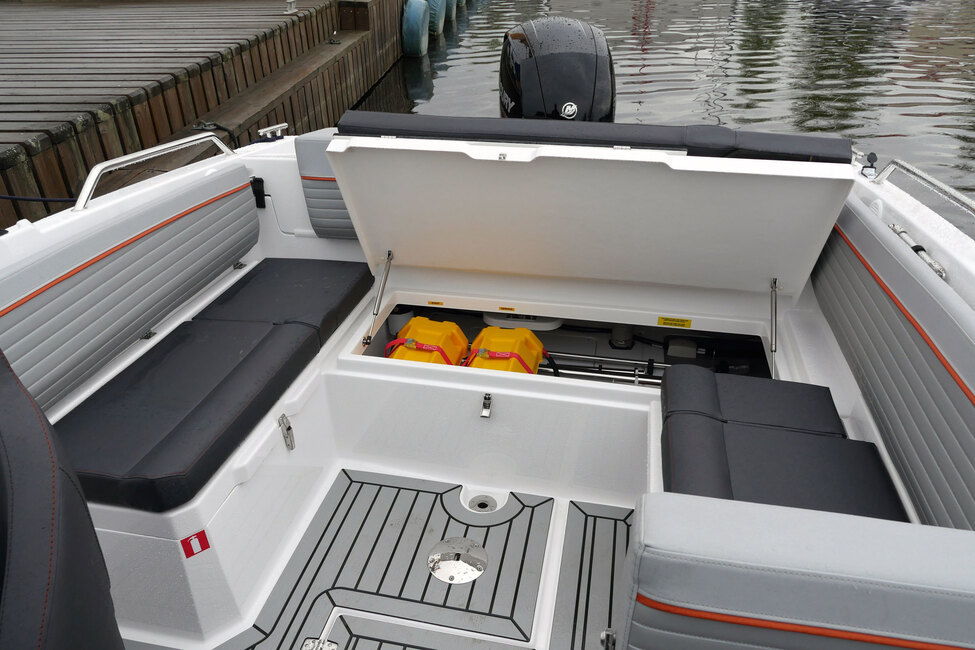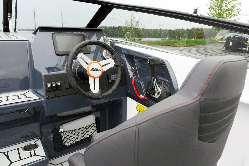 Keulan tuulilasi taittuu keskeltä, jolloin ohjaamoon pääsee laskeutumaan integroituja askelmia pitkin. Kuljettajalla on hyvät oltavat. Kojelaudasta löytyy mittarien avulla tärkeimmät tiedot ja edestä löytyy paikka lisävarusteiselle 12-tuumaiselle karttaplotterille. Istuin on offshore-mallia eli säädettävissä, jos haluaa hieman korkeamman asennon. Navigaattorin istuin on niin ikää asiallinen ja molemmat erillisistuimet kääntyvät avotilaa kohti, kun on aika pysähtyä ja nauttia retkieväistä.