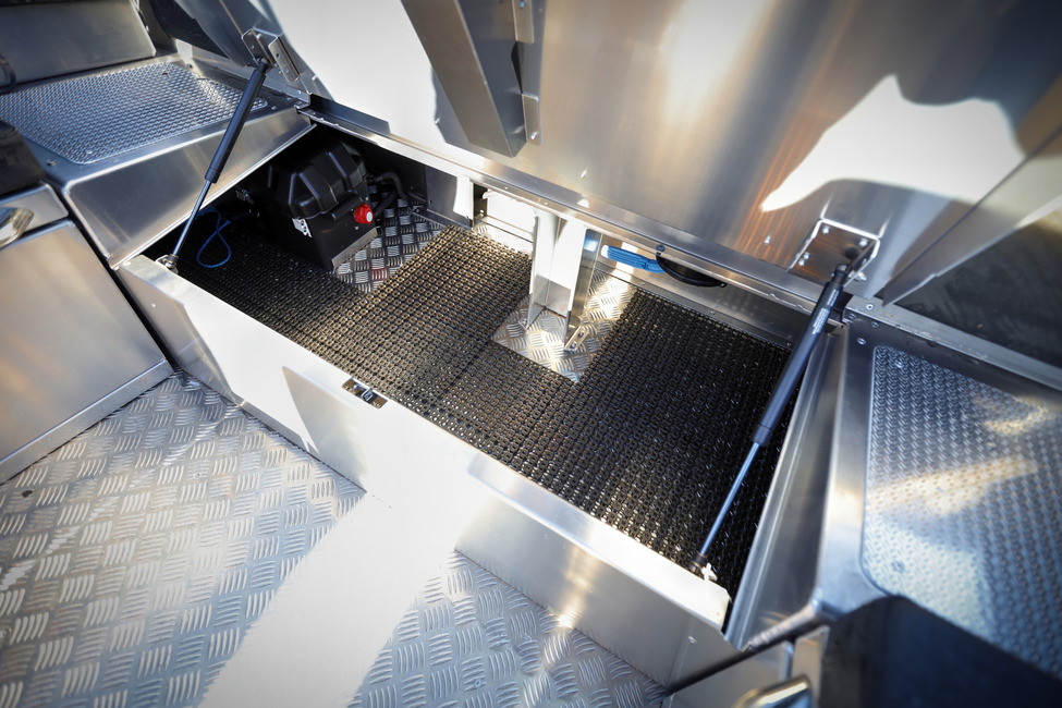Buster Magnumin lattia on liukuestekuvioitua alumiinia, kaiteet, knaapit ja muu kansiheloitus ruostumatonta terästä.