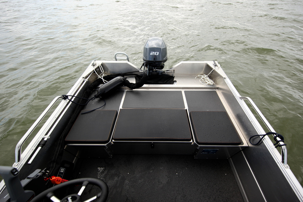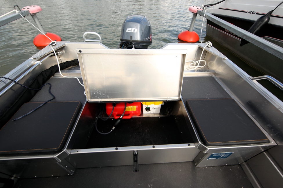 Sama laaja ja vakaa tila on myös perätuhdon alueella. Myös sitä voi käyttää niin kalastamiseen kuin istumiseen. Perästä luukun alta löytyy myös veneen kanisterimallinen polttoainetankki sekä akku.
