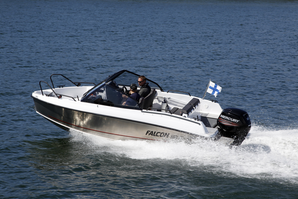 Falconien perusratkaisut ovat hyvin mietittyjä ja kotimaisten venetrendien mukaisia. Alumiinirunko yhdistyy lasikuitukanteen, jossa on harkitusti ja tyylikkäästi toteutettu käteviä ratkaisuja.