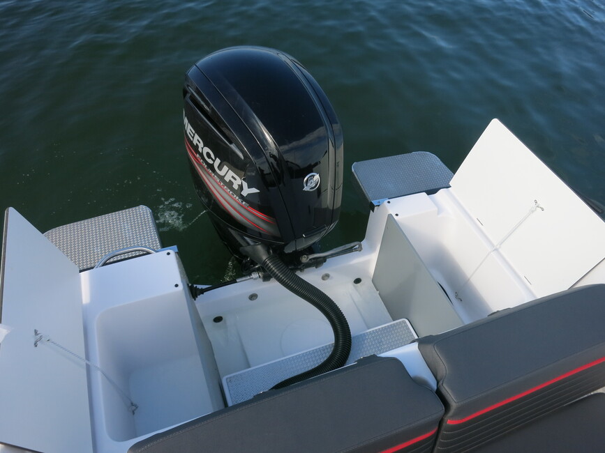 Kyytiin pääsee perästäkin, sillä uimatasot jatkuvat perämoottorin tasalle asti. Perässä on selkänojana toimiva kuomukotelo, jonka sivulta pääsee molemmin puolin astelemaan matkustamoon. Penkin sivuille jää sopivasti askelmat.