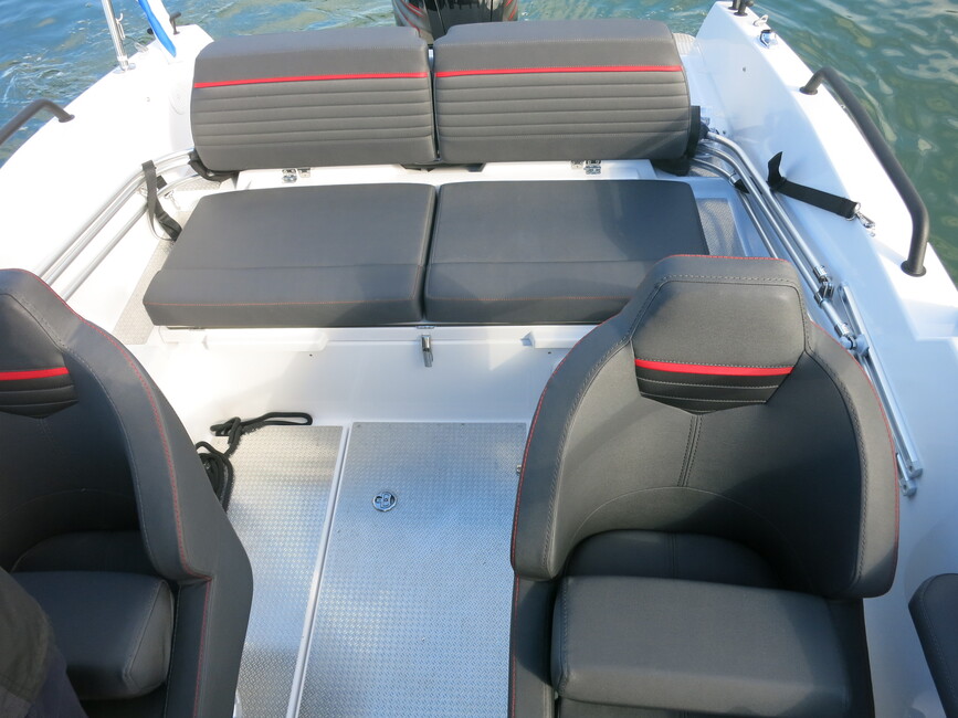 Kuskin paikalla on hyvä olla. Säädettävä offshore-penkki on mukava istua, ja se on tyyliltäänkin kuin kalliimmasta veneestä. Mikäli korkeussäätö ei ole aivan pohjassa, penkki myös joustaa hieman.
