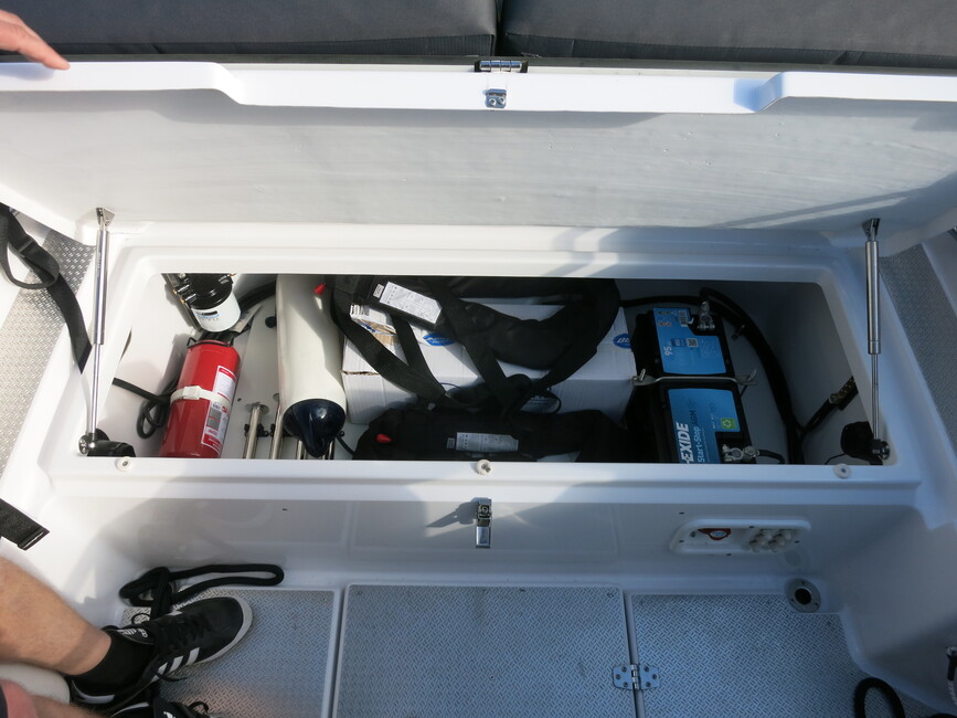 Säilytystilaa on niin hyvin kuin oikeastaan tällaisessa veneessä voi olla. Penkkien alla on tilaa, köysille on boksit edessä ja takana, pulpettien sisällä on tilaa – ja sitten on vielä pitkä tila veneen keskilattian alla!