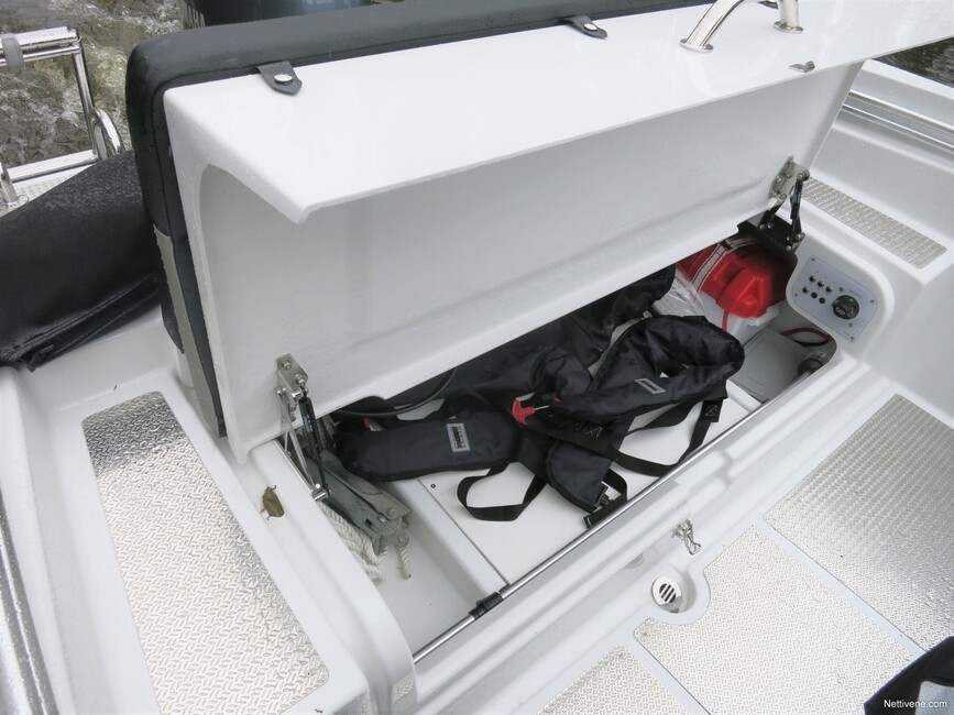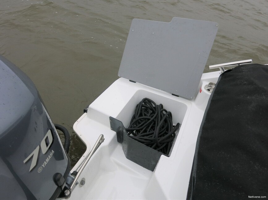 Käytännöllisyys sen sijaan on huippua. Jo sisään astuessa on upeaa, miten veneeseen kulku on suunniteltu toimivaksi ihan joka suunnasta. Keulassa on hyvät kaiteet ja hienot leveät askelmat. Keulan tylppä muoto ylipäänsäkin auttaa sieltä kyytiin ottamista.
