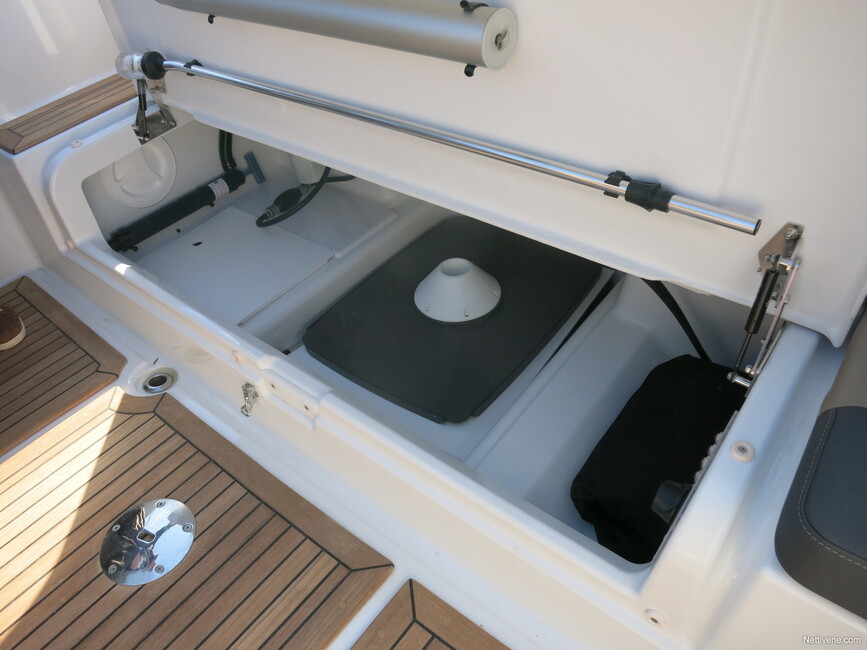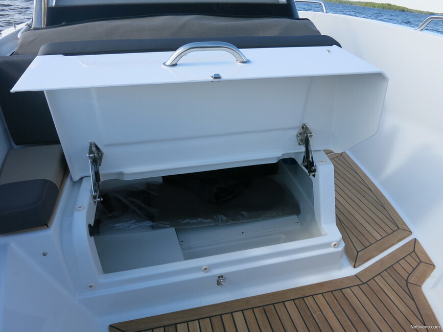 Aivan keulassa ei ole penkin alla varsinaista säilytystilaa ollenkaan, vaan pelkkä köysiboksi. Sellaiset löytyvät myös perästä, molemmin puolin. Asiallista ja toimivaa perusratkaisua, kuten vene muutenkin.