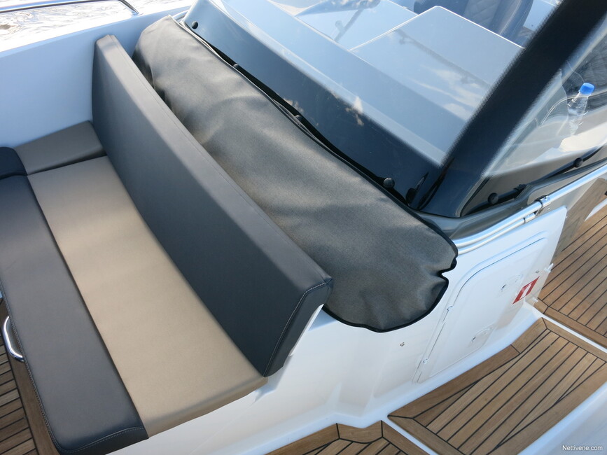 Vakiona sisätiloissa ei ole mitään erityisen kekseliästä. Tilaa on kaikin puolin paljon, kun veneessä kokoa riittää. Lattiatilaa on kävelyyn ja isompien tavaroiden kuljetukseen. Näyttävä tiikki on lisävaruste. Keulassa on vakiona paikat lepuuttajille, kunhan ne vain jaksaisi aina irrotella ja viedä ne ajon ajaksi sinne.