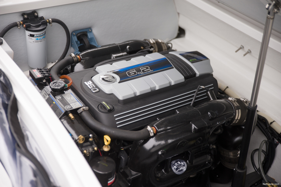 Vaikka aurinkoisen päivän satamaoleiluun 25 S on myös omiaan, veneen meininki suorastaan kutsuu ajamiseen. Moottorifanaatikkoja tähän auttaa koeajoveneen 350-hevosvoimainen Mercruiser. Tämä 6,2-litrainen moottori lymyää tyylikkäästi sähköllä aukeavien takasohvan ja aurinkopedin alla. Moottorin ihailun lisäksi luukkua täytyy avata myös lisävarusteisen ajokuomun esiin saamiseksi.