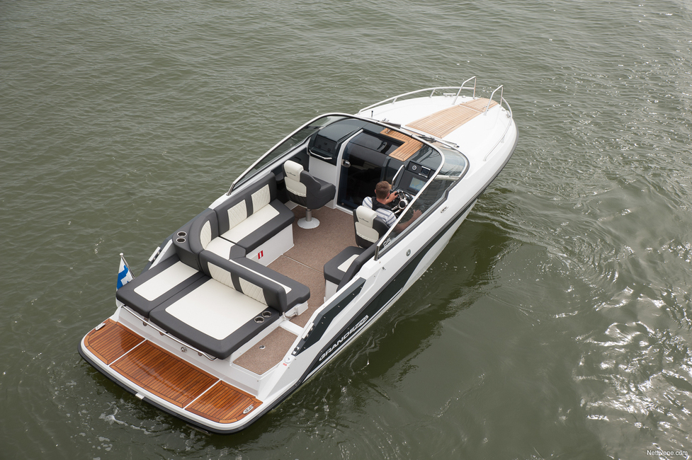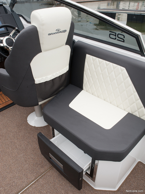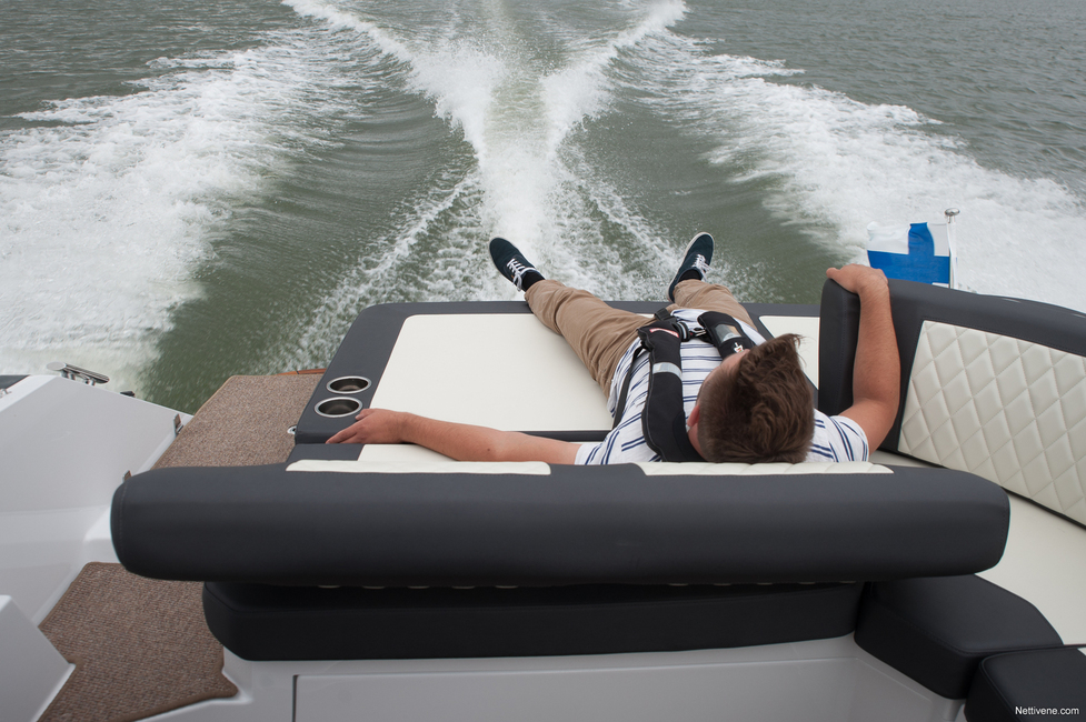 Grandezzan hauska bravuuri on sohvan takaselkänojan kääntö toisin päin. Näin siitä saa selkä- ja pääntuen veneen takaosan aurinkopedille. Se näyttää ja tuntuu todella kivalta paikalta kahdelle auringonpalvojalle tai merimaisemien ihailijalle. Siinä pysyy yllättävän hyvin myös ajossa, kevyessä kelissä mukavasti veneen ollessa plaanissakin. Paikka on elämyksellinen matkustettava V8-moottorin mourutessa alla ja peräaaltojen suihkiessa jalkojen juuresta kauniiseen merimaisemaan.