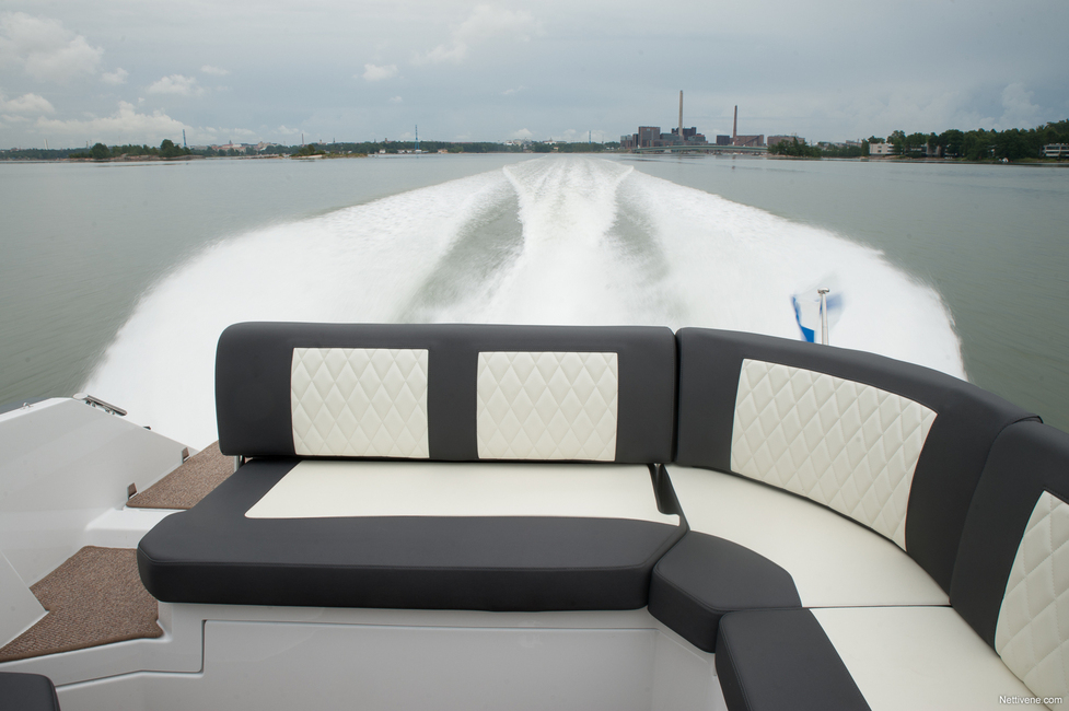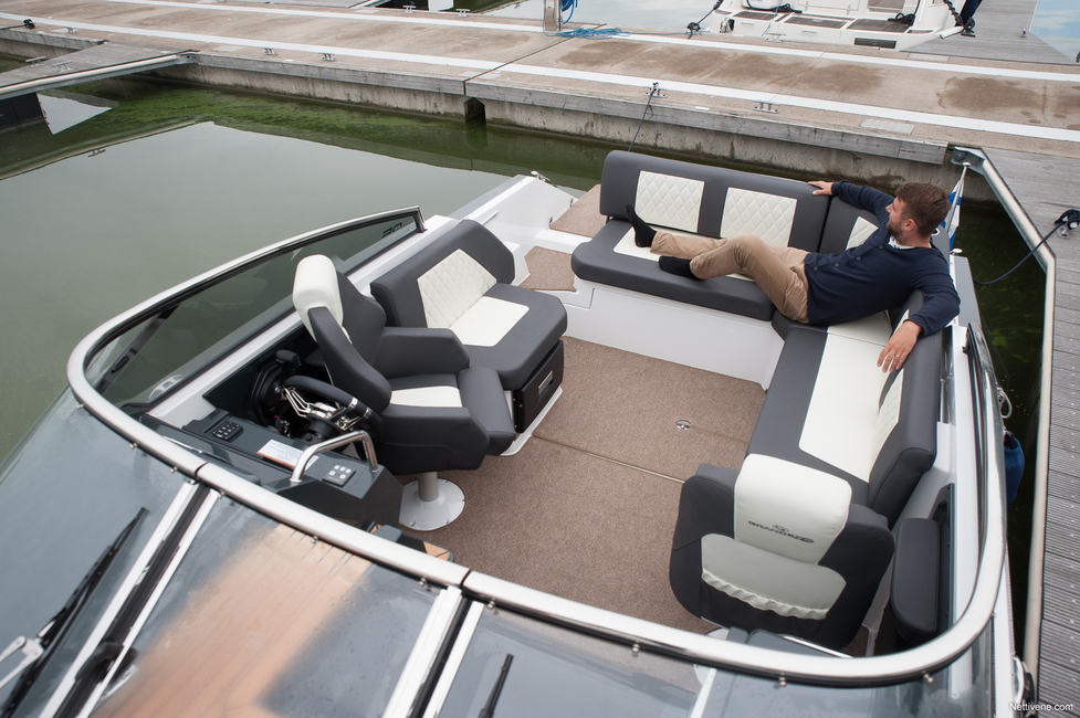 Pääasia veneessä silti on ulkona oleva matkustamo. Siellä muhkealla L-sohvalla istuu viisi henkeä sopivasti. Materiaali on miellyttävän laadukkaan ja viimeistellyn tuntuista. Sohvan ääreen saa vakiovarusteisen pöydän, jonne ei kuitenkaan erityisen hyvin ylety kaikilta paikoilta. Siinä ei myöskään ole mukitelineitä. Niitä löytyy sohvan takanurkasta veneen ulkoreunasta.
