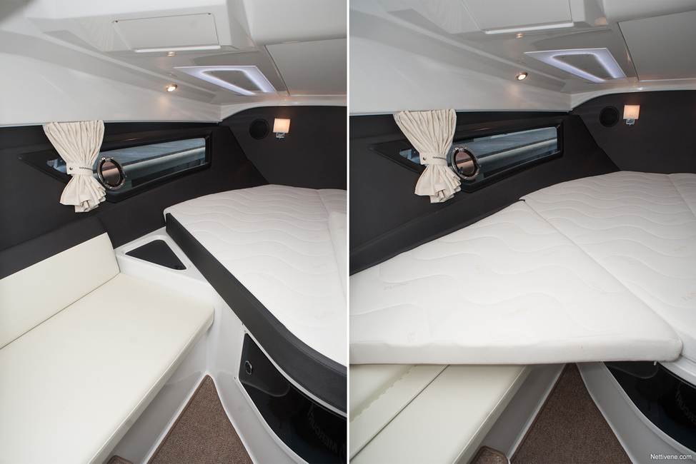 Säilytystilaa löytyy isompi luukku sängyn patjan alta ja pienempi lokero sängyn sivulta. Mitenkään erityisen ylenpalttista säilytystilatarjonta ei tämän kokoiseksi veneeksi kuitenkaan ole.