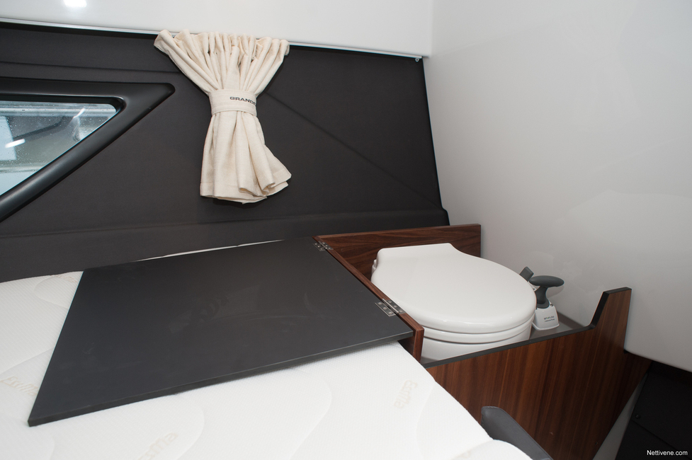 Toisaalta vähän isompikin löytyy valmistaja Finn-Marinin kansanmerkin Finnmasterilta: sen isoin daycruiser T8. Se tarjoaa hitusen enemmän asuttavuutta neljällä nukkumapaikalla ja erillisellä WC-tilalla. Grandezza 25:ssä punkka on kahdelle ja WC samassa ilmatilassa sen kanssa.