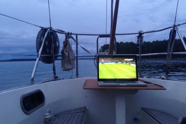 Kiitos teknologian, katsomme pelin koneelta Teslan sitloodassa. Toista oli neljä vuotta sitten. MM-finaali. Rantauduimme Hiittisiin siinä toivossa, että kylällä olisi paikka, jossa on televisio. Ei ollut. Joku, neuvoi, että menkää Rosalaan, rantakahvilassa on televisio. Irrottauduimme ja purjehdimme Rosalaan. Ei ollut televisiota Rosalassa. Askelsimme laituria, kartoitimme veneitä, etsimme televisioantennia. Emme löytäneet. Kuuntelimme pelin radiosta.