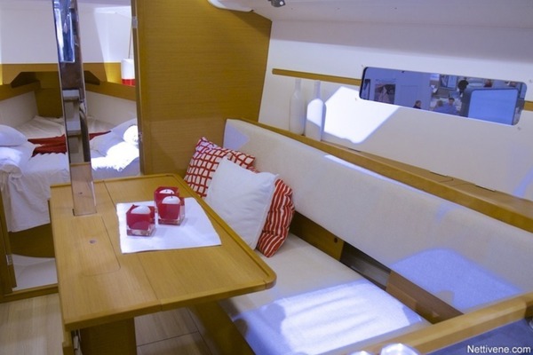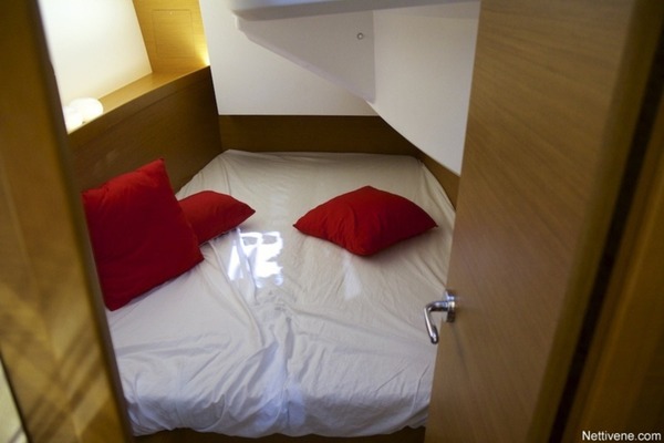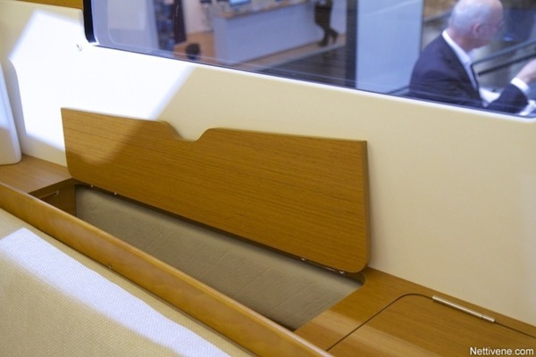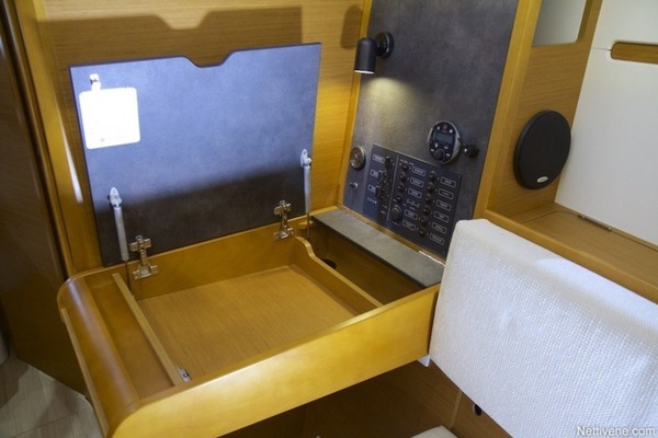 Sisältä #49 Sun Odysseu on silmää miellyttävä ja käytännöllinen. Kajuuttoja on joko kaksi tai kolme, tämän kokoluokan veneessä käytännössä useimmiten kaksi. Tällöin vessa on perässä toisella laidalla, ja sen takana runsaasti varastotilaa. Styyran puolella oleva hytti on mukavan valoisa, ja katossa olevasta luukusta pääsee suoraan sitloodaan. Hauska ratkaisu tämäkin.