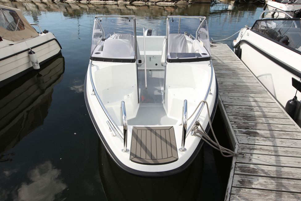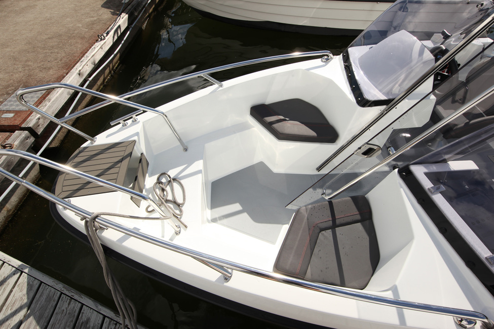 Pieneksi veneeksi isokokoisen keulan liukuesteen kautta on helppo nousta kyytiin. Keulassa ei ole säilytystilaa, vaan ainoastaan avolokero köydelle ja tilaa astumiseen sekä istumiseen.