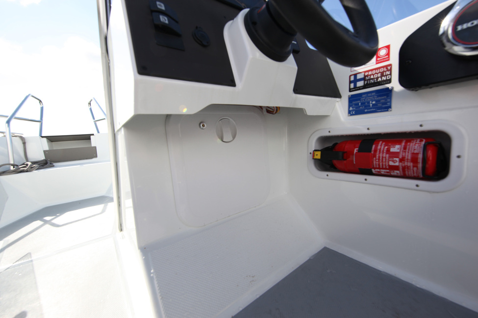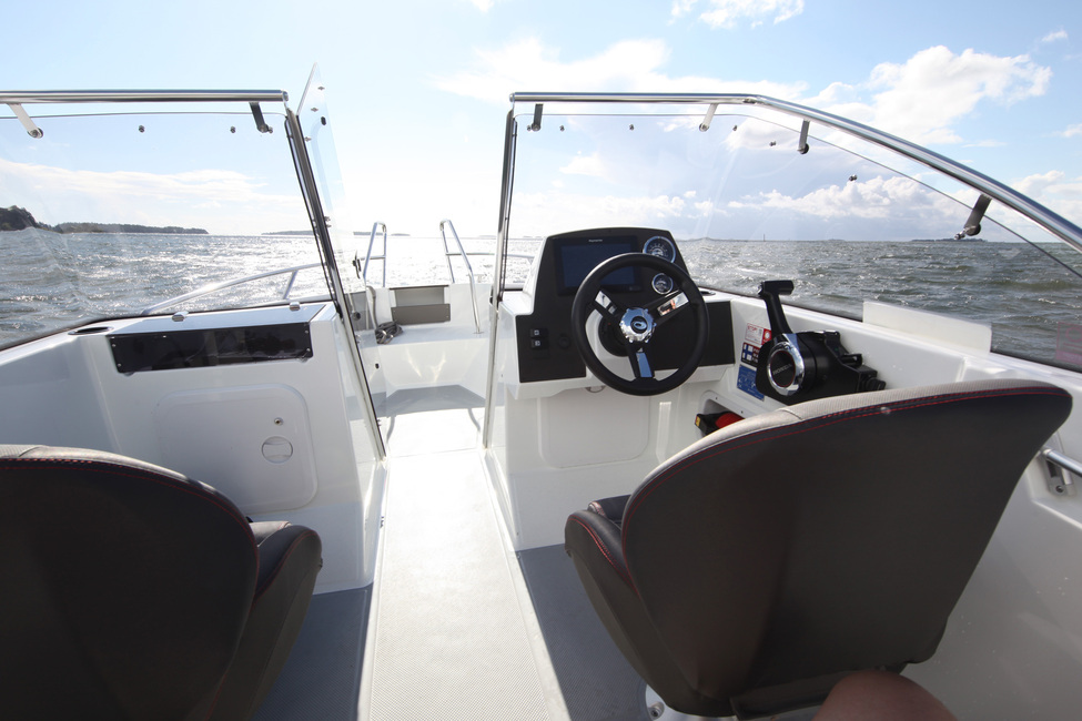 Veneen keskellä olevan korkean tuulilasin etupuolella on istumapaikat. Kuskille ja kartturille on omat erilliset istuimet ja takaa löytyy sohva. Yllättäen tiiviin veneen tilat ovat sellaiset, että kuusi ihmistä mahtuu aivan mainiosti kyytiin.