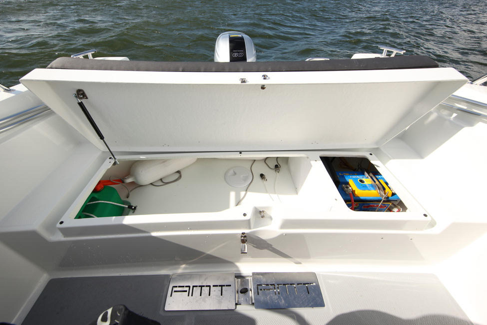Säilytystilat ovat pienessä veneessä rajalliset, mutta AMT 165 BR:ssä on tätä selvästi mietitty. Vaikka tuulilasin etupuolella olevien istuimien alla ei ole tavaratilaa, löytyy sitä molemmista pulpeteista. Suurin tila löytyy takasohvan alta. Mukava on, että tilaa siellä ei vie irtonainen polttoainetankki, sillä AMT 165 BR:ssä on kiinteä 60 litran polttoainesäiliö.