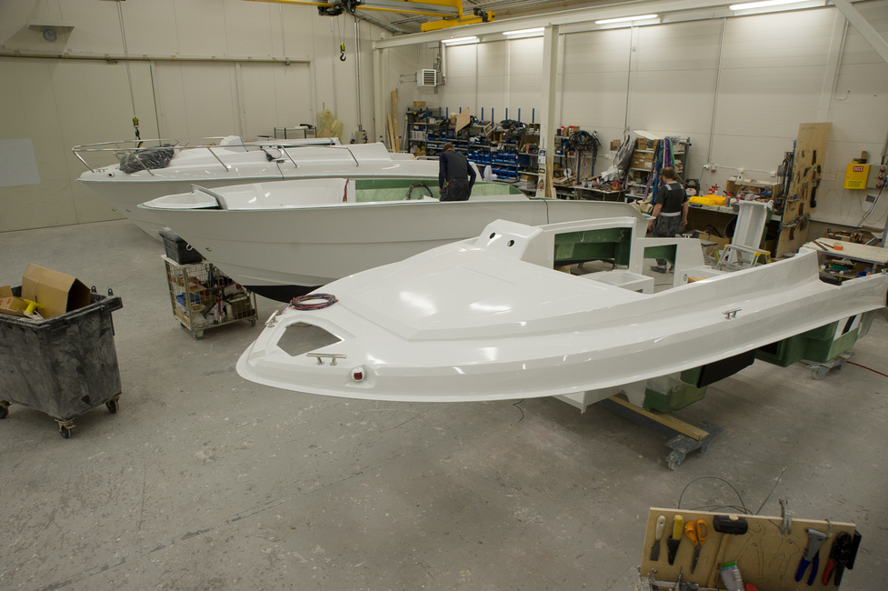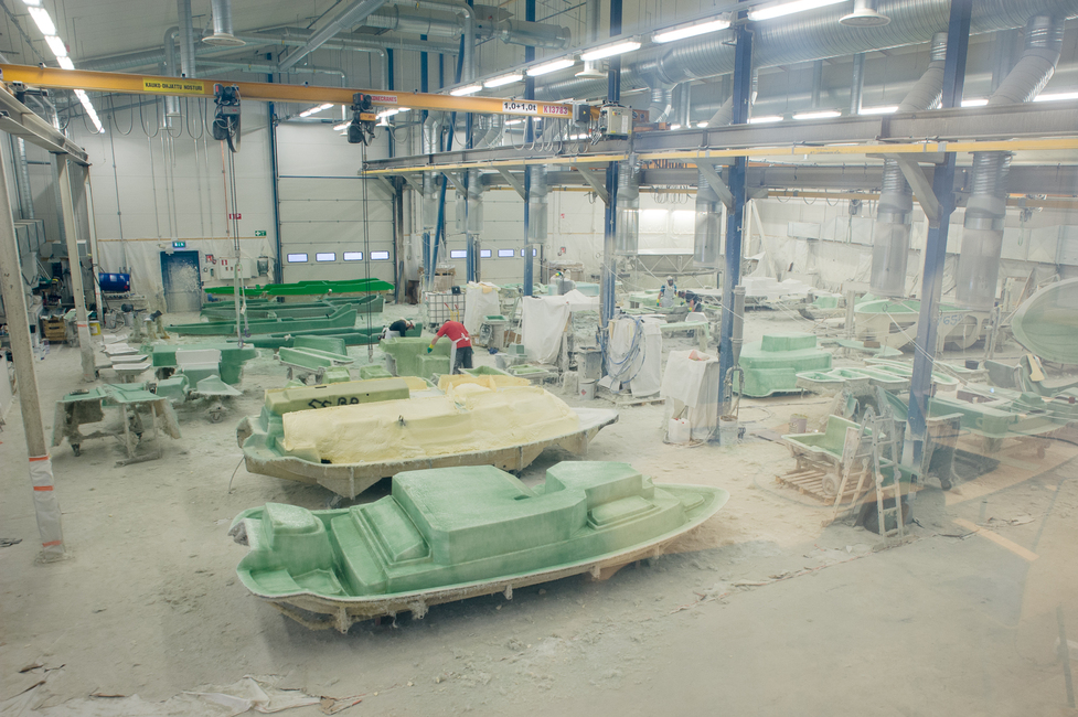 Seliö Boatsilla kaikki muoteissa tehtävä työ on kätevästi yhdessä hallissa. Seuraavaksi erillisessä pikkuhuoneessa tehdään lasikuituosien valmistelu kokoonpanoa varten. Erillinen huone on hyvä, sillä tämä tekeminen on välillä äänekästä ja lähes koko ajan pölyistä. Suojavaatteet, -maskit ja kuulonsuojaus ovat tarpeen.