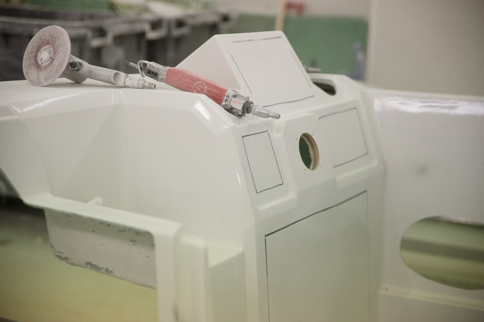 Kaikki lasikuituosat kulkevat tämän viimeistelyn kautta. Muottien jäljiltä röpelöt reunat siistitään. Osat valmistellaan kokoonpanoa varten tekemällä niille kunkin tarpeen mukaan leikkauksia, hiontoja ja karhennuksia. Niihin voidaan myös tehdä jo valmiiksi merkintöjä asentajia varten.
