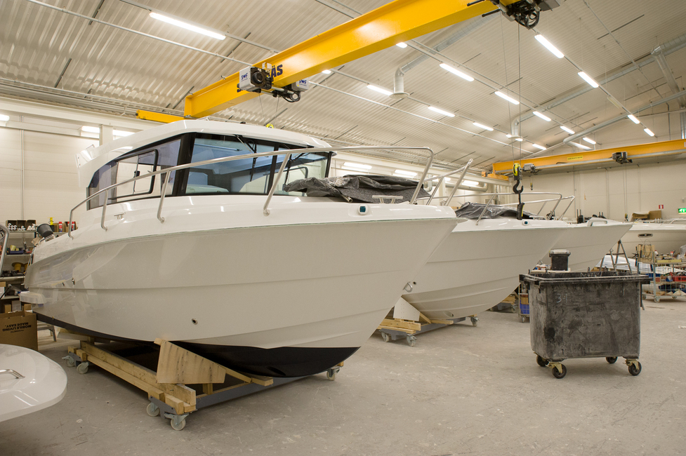 Isojen 7-8-metristen valmistus tapahtuu Seliön toisissa halleissa. Näistä oheisissa kuvissa näkyy sieltä pari kuvaa Finnmaster Pilot 7 W -hyttiveneen ja Yamarin 79 DC:n valmistuksesta.