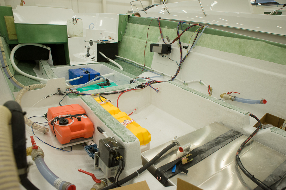 Kärryn päällä kulkeva pohjaosa saa esimerkiksi kiinteän polttoainetankin ja isommat matkaveneet makeavesi- ja septitankkinsa. Myös erinäisiä sähköjohdotuksia tehdään jo tässä vaiheessa. Näin johdot kulkevat siististi rakenteen uumenissa eivätkä näy rumasti veneen päällä. Toisaalta korjaamisen kannalta tällainen ratkaisu ei ole niin suosittu, mutta asiakkaan esteettinen silmä on oikeassa…