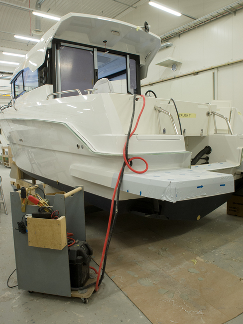 Laminointihallin ja leikkaushuoneen jälkeen valmiit lasikuituosat siirtyvät Seliö Boatsilla viimeiseen ja siisteimpään tilaan: varusteluhalliin.
