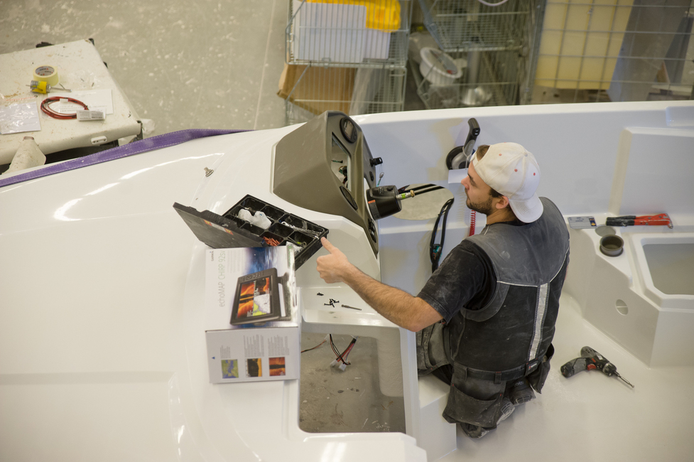 Erilaisia osia veneissä riittää, kaiteista karttaplottereihin ja tankeista penkkeihin. Seliö Boats oikeastaan valmistaa veneisiin vain lasikuidun. Kaikki muu tulee alihankkijoilta ympäri maailman, mutta ne kootaan yhteen täällä. Nytkin pääsyä veneisiin odotteli esimerkiksi teakia Indonesiasta, ikkunalaseja Norjasta ja tuulilasinpyyhkimien moottoreita Hollannista.