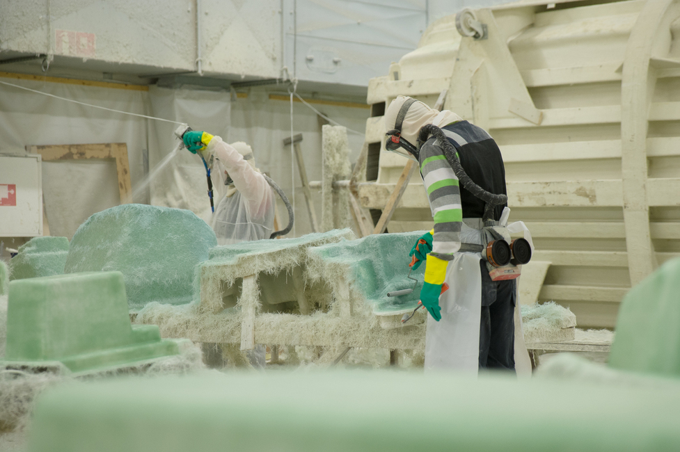 Heti lasikuidun ruiskutuksen jälkeen pinta tasoitetaan telalla, jotta siihen ei jää ilmakuplia. Tämän jälkeen osa osista voi saada välillä päälleen muutakin kuin ruiskutettua lasikuitua.
