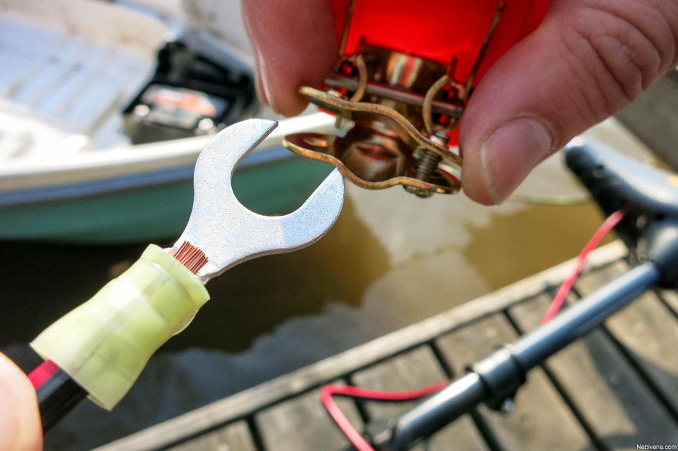 Johtojen kiinnittämiseen akkuun tarvitaan vielä akkukengät. Testiin hankittiin kätevällä pikalukituksella olevat mallit, jotka on helppo vain napsaista paikalleen, kun akku tuodaan latauksesta veneeseen.