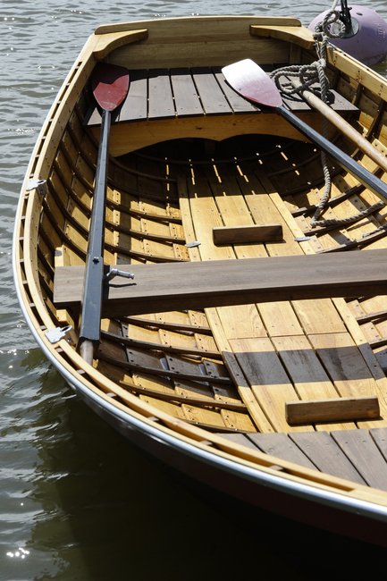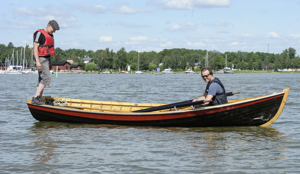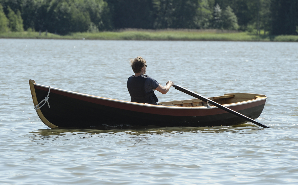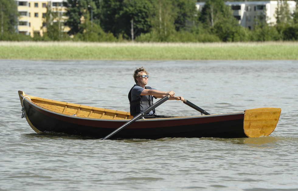 Parkkonen nyökkkää ja lisää, että oikea peräsin voisi olla hyvä juttu. -Sen voisi lukita yksin soudettaessa ja kaksin sillä saisi oivaa ohjattavuutta. Kaksin tämä kulkeekin parhaiten ja on silloin myös mökkiveneeksi oikein hyvä soutuvene.