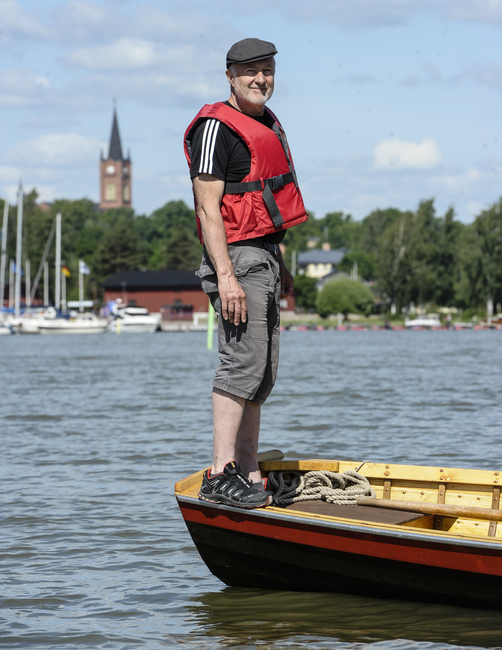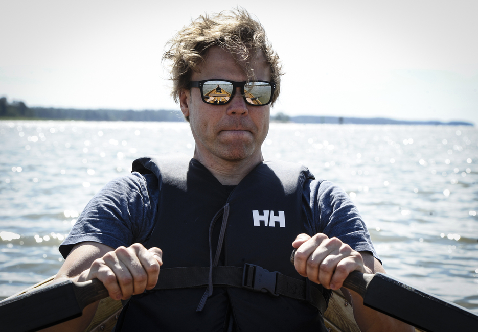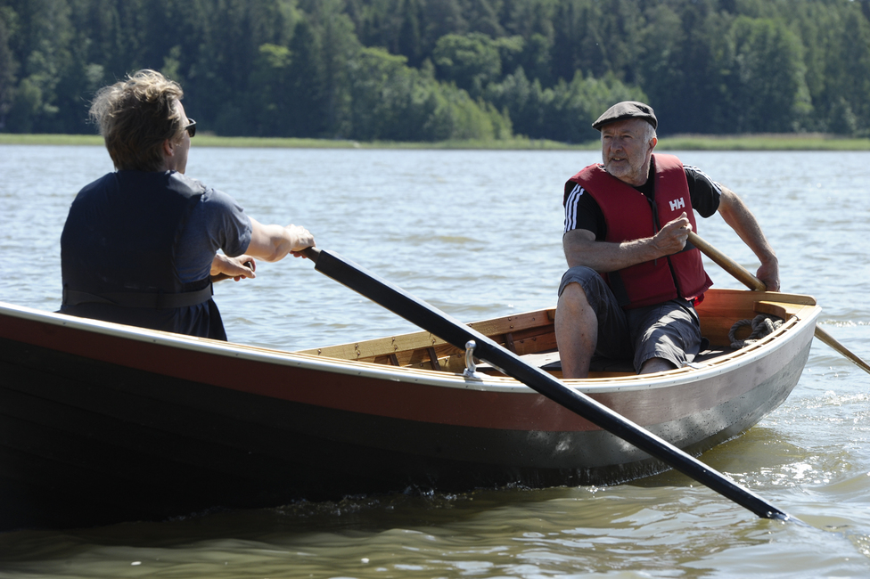 -Nyt lisätään siitä varmaan puolet takaisin. Puuveneessä se on helppo toimenpide, Mattsson selittää ja nousee peräpenkille airon kanssa perämieheksi. Erkki kulkee nyt vakaasti ja suoraan kuin juoppo ehtoollisviinille.