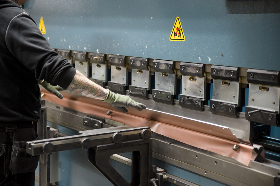 Ensimmäinen työvaihe Snellin tehtaalla onkin sitten näiden levyinä tulleiden kappaleiden särmäys eli taivutus. Särmäyspuristin on kookas tietokoneohjattu laite, jolle on valmiiksi syötetty kulloisenkin osan taivutus. Vierailullamme tehtiin juuri kuomukoteloiden kansia, minkä sanottiin olevan hyvinkin helppo tehtävä.