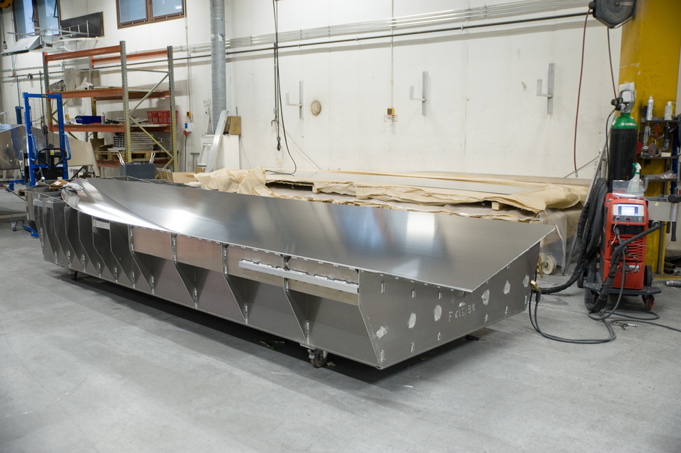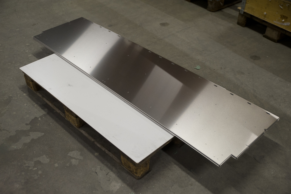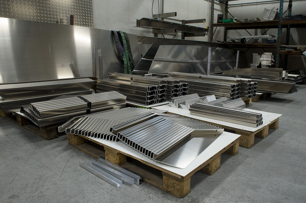 Alumiini tulee sisään ensimmäisen hallin ovesta. Kuormia tulee tasaisin väliajoin Keuruulta Suomen Vesileikkaus Oy:ltä, joka hankkii materiaalin tukkureilta Euroopasta ja laserleikkaa sen valmiiksi. Näin levyt ovat heti halliin tullessaan oikean muotoisia ja myös oikeista kohdista rei’itettyjä.