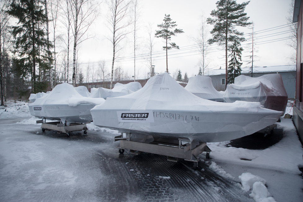 Lopuksi tehtaalta lähtövalmiin veneen kylkiin levitetään alumiinia hapettumiselta suojaavaa öljyä ja sitten laitetaan muovit päälle kuljetusta varten. Fastereita valmistuu tehtaalta keskimäärin 6-7 kappaletta viikossa. Pienimipiä 460-malleja tehtäessä veneitä voi valmistua jopa kymmenen, isoimpia 625/635-malleja tehtäessä viisi.
