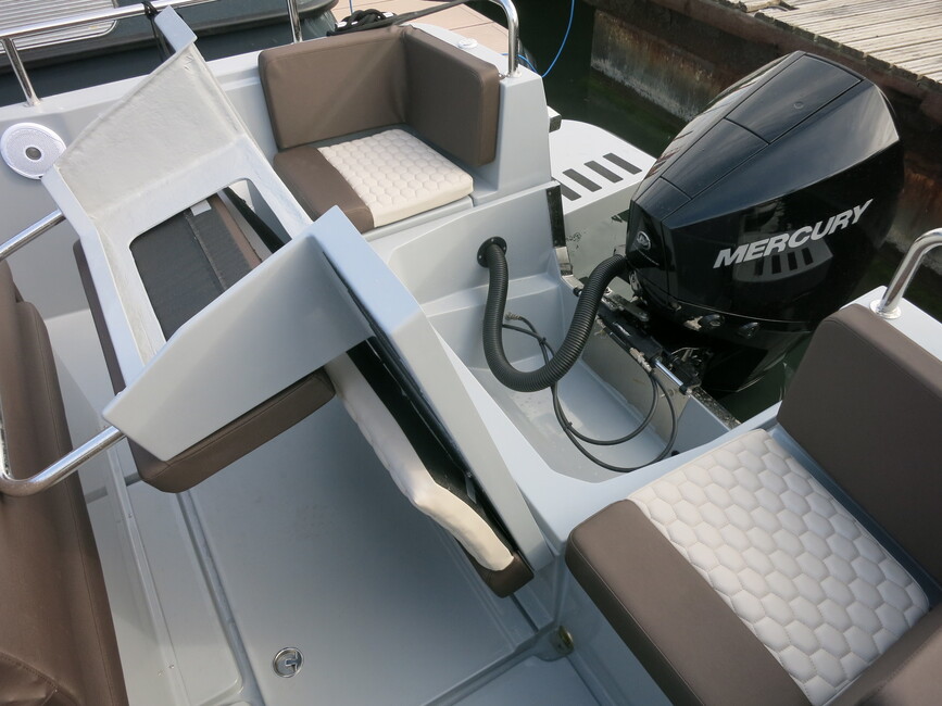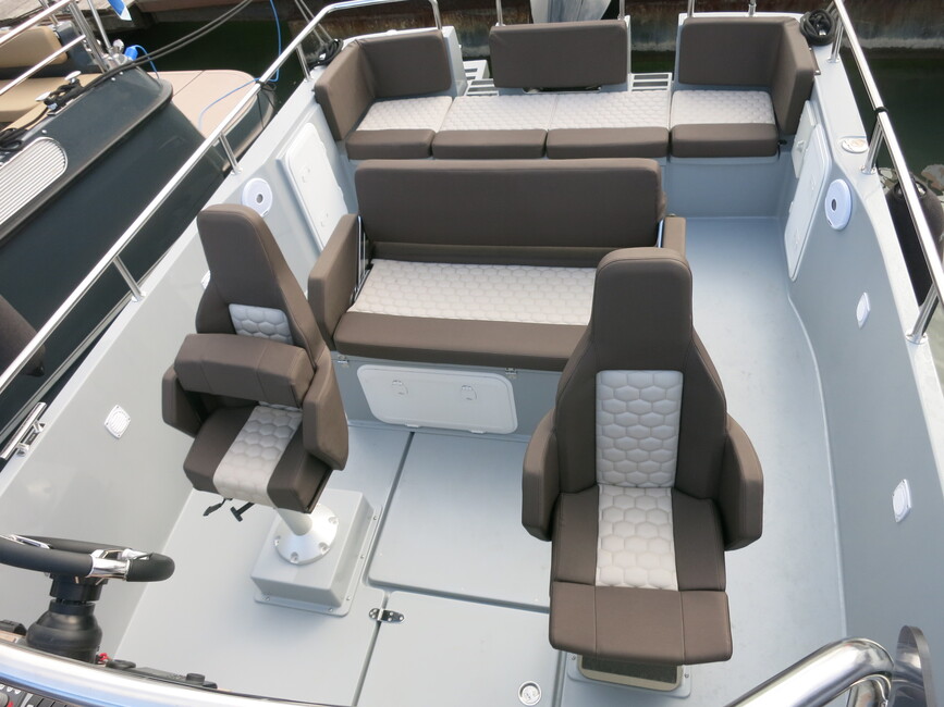 Esimerkiksi pulpetin taakse istuu kaksi ja takapenkille neljä. Keskimmäisen penkin voisi jättää vaikka kokonaan pois. Ja niin voikin: veneen saa ilman sitä, jolloin avointa tasaista turkkitilaa on neliömäisen muotoisena kolmisen neliömetriä. Lisäksi pitkiä tavaroita saa aseteltua pulpetin molemmin puolin. Työ- tai yhteysvenekäyttöön tämä alkaa tuntua entistä lupaavammalta. Pitää vain pukeutua sään mukaan.