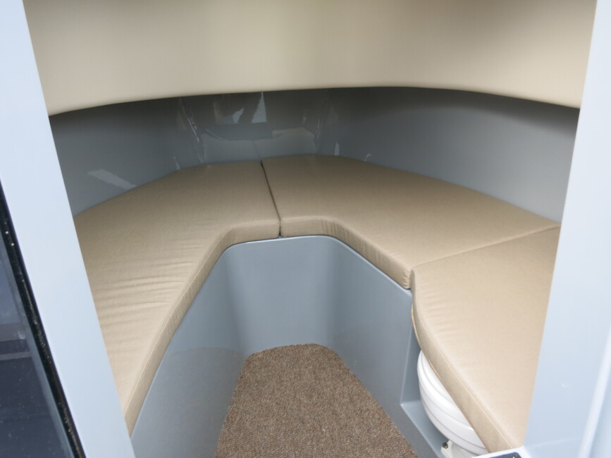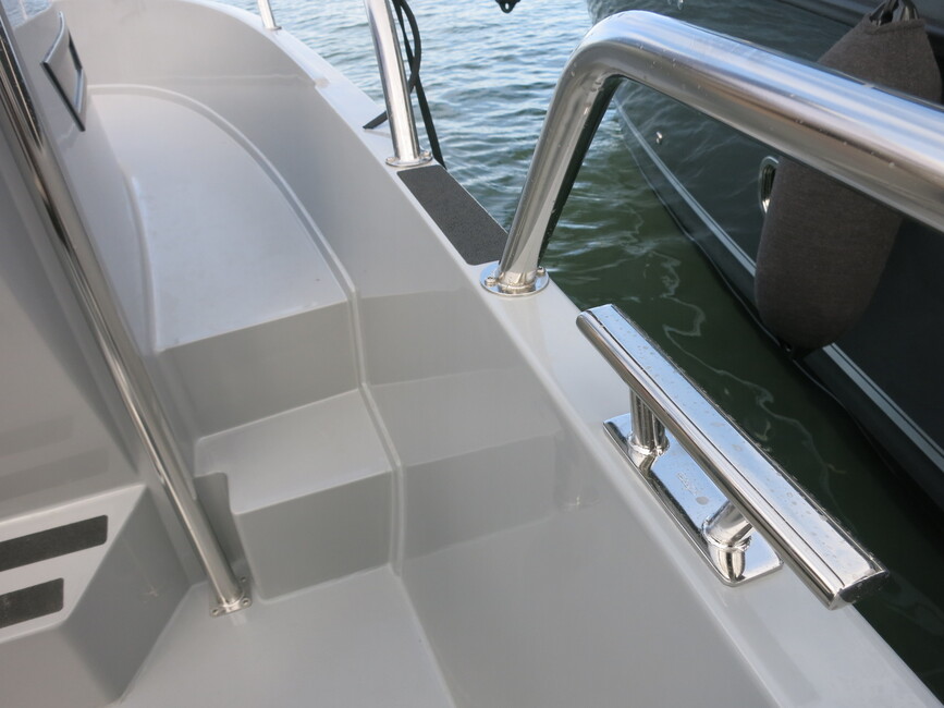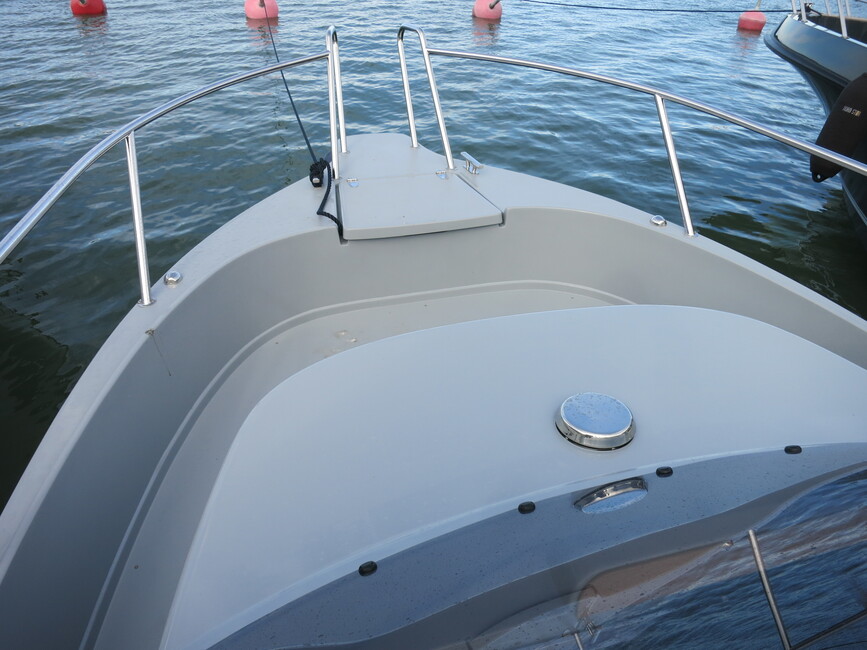 Tavaralokeroiden vähyys ei ehkä ole ongelma, sillä kansitilaa kamppeille riittää ja onhan keulassa jättimäinen hytti. Sinnehän daycruiser-veneilijät yleensä heittävät liivit, takit ja muut kamppeet.