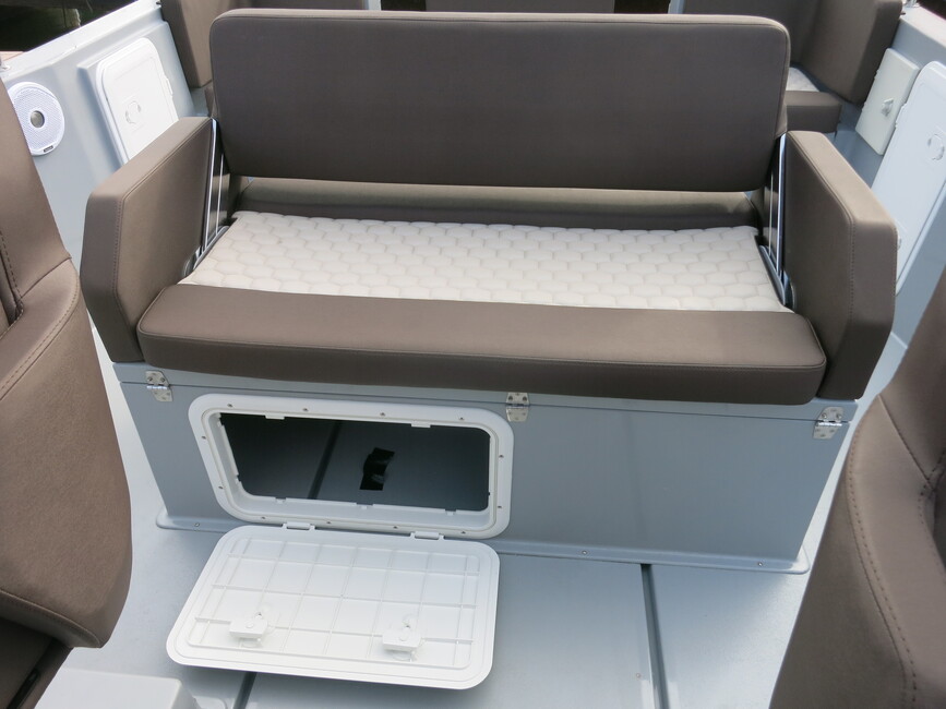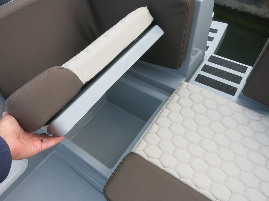 Säilytystiloja penkkien alla ei ole kovin paljoa. Takapenkkien reunapaikkojen alla on pikkutilat köysille – sinne ne on laitettava, sillä uimatasoilla ei ole köysibokseja. Keulasta perinteinen hyvä köysiboksi löytyy. Perässä lattian alla on melko pieni säilytystila ja valinnaisen keskipenkin alla on myös tilaa.