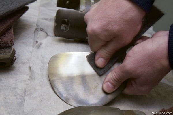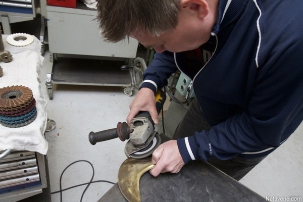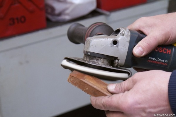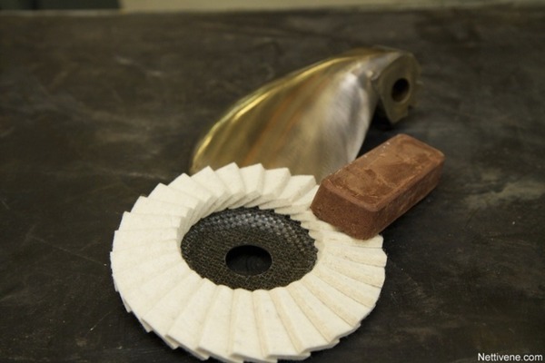Erittäin hienon kulmahiomalaikan jälkeen potkurin kiiltoa voi etsiä kulmahiomakoneen kiillotuslaikalla ja värilliselle metallille tarkoitetulla kiillotusaineella. Ensin kiillotusainetta, tässä tapauksessa punaruskeaa, hiotaan vähän kiillotuslaikan reunaan, ja sen jälkeen laikalla käydään potkuri läpi tarkasti. Todella tarkka veneenomistaja voi halutessaan kiillottaa potkurin myös vesihiomapaperilla, mutta koneellinen kiillotus riittänee suurimmalle osalle.