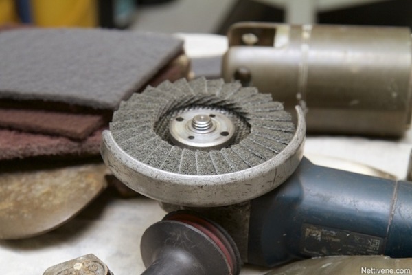 Kuten kaikki hiomatyö, myös potkurin puhdistus aloitetaan karkeammilla työkaluilla ja edetään sitten hienompiin. Koivukangas aloittaa työt kaikkein hienoimmalla hiomalaikalla, jonka kulmahiomakoneeseen saa kiinni. Sekin syö pinnan tahroja tehokkaasti, vaikka menee toisaalta myös tukkoon helposti. Tästä huolimatta erityisesti potkurin lapojen reunat on syytä käydä läpi hyvin varovasti jos ollenkaan. Potkurin voi kiinnittää penkkiin, mutta penkin hampaiden väliin täytyy muistaa laittaa vaikka sopiva liina naarmujen välttämiseksi.