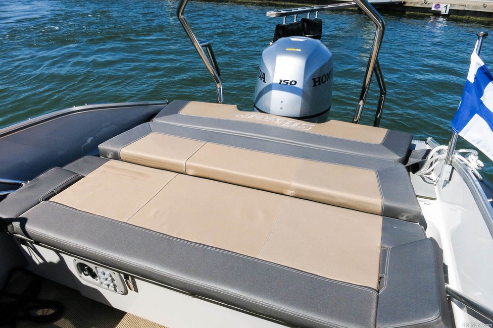 Keulassakin on molemmin puolin suuret säilytystilat ja istuimet (lisävarusteisine) pehmusteineen. Joissain kilpailijoissahan keula on karua ja tyhjää tilaa ilman penkkejä, tässä sielläkin voi hengailla. Koeajoveneessä oli kuskilla ja hänen vierellään myös leppoisamman sohvamaiset lisävarusteistuimet oleilukäyttöön.