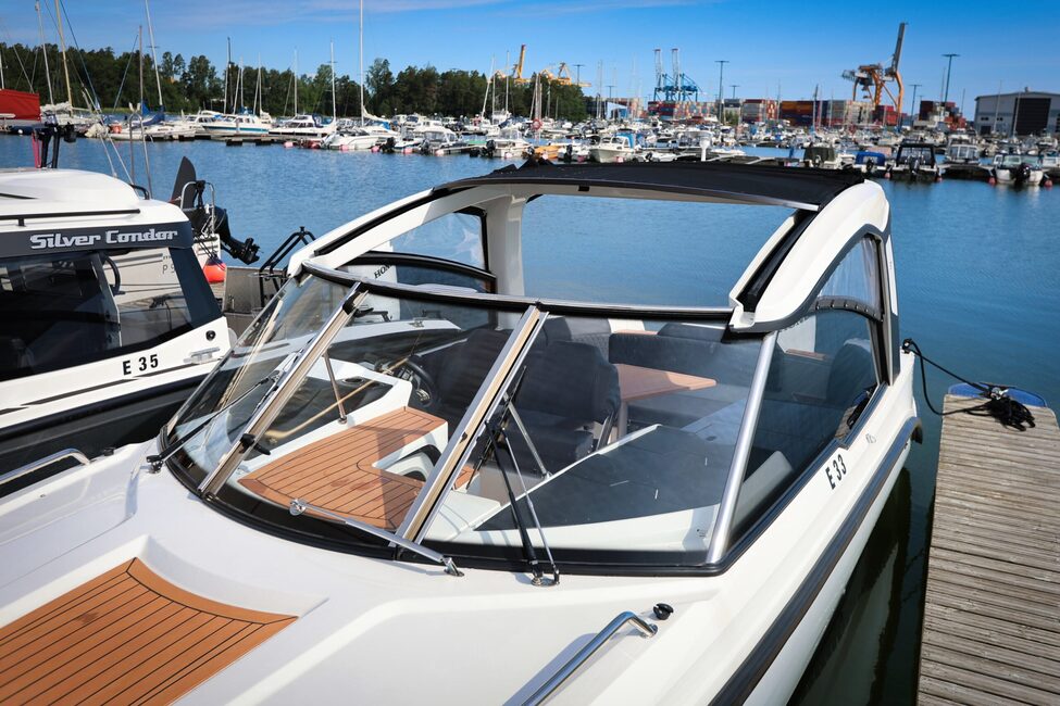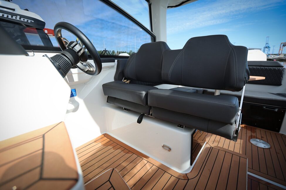 Erityishuomiota on annettu näkymille. Tuulilasi ulottuu pitkälle veneen sivuille ja tarjoaa suojaa sekä erinomaisen näkyvyyden. Lasit ovat ST-mallissa entistä korkeammat, ja matkustamon lattiaa on madallettu pentterin kohdalta, jotta seisomakorkeus säilyy hyvänä myös katto suljettuna. Koko istumakaukalon saa peitettyä mukana tulevalla kuomulla ja kuomuikkunoilla – ratkaisu, joka toimii hyvin yöpyessä.