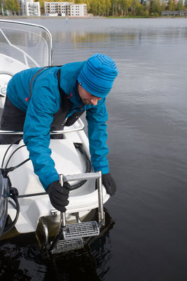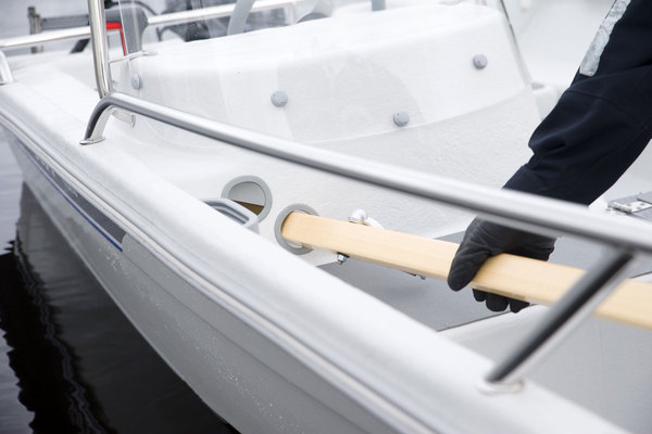 Hauska ja kätevä yksityiskohta ovat muuten veneessä olevat hankaimet sekä ohjauspulpetin läpi vedetyt säilytysreiät airoille. Matalassa paikassa moottoria varoen tai bensan loppuessa venettä voi siis halutessaan soutaa.