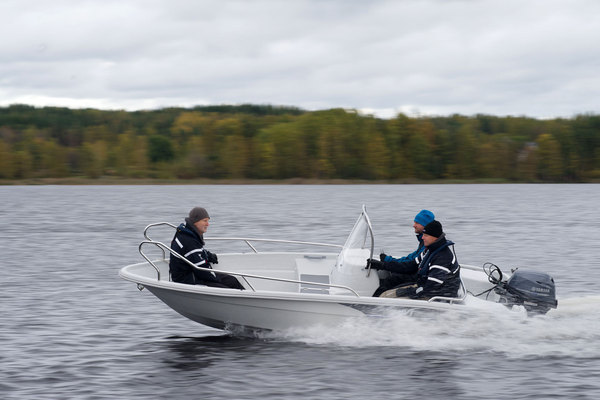 Neljä isoa miestä on tässä veneessä 20-heppaiselle koneelle liikaa. Kovasta yrittämisestä huolimatta venettä ei saatu nousemaan liukuun. Yksi kaveri rannalle, niin tilanne muuttui. Vene nousi plaaniin vaivattomasti, kunhan yksi oli keulassa.